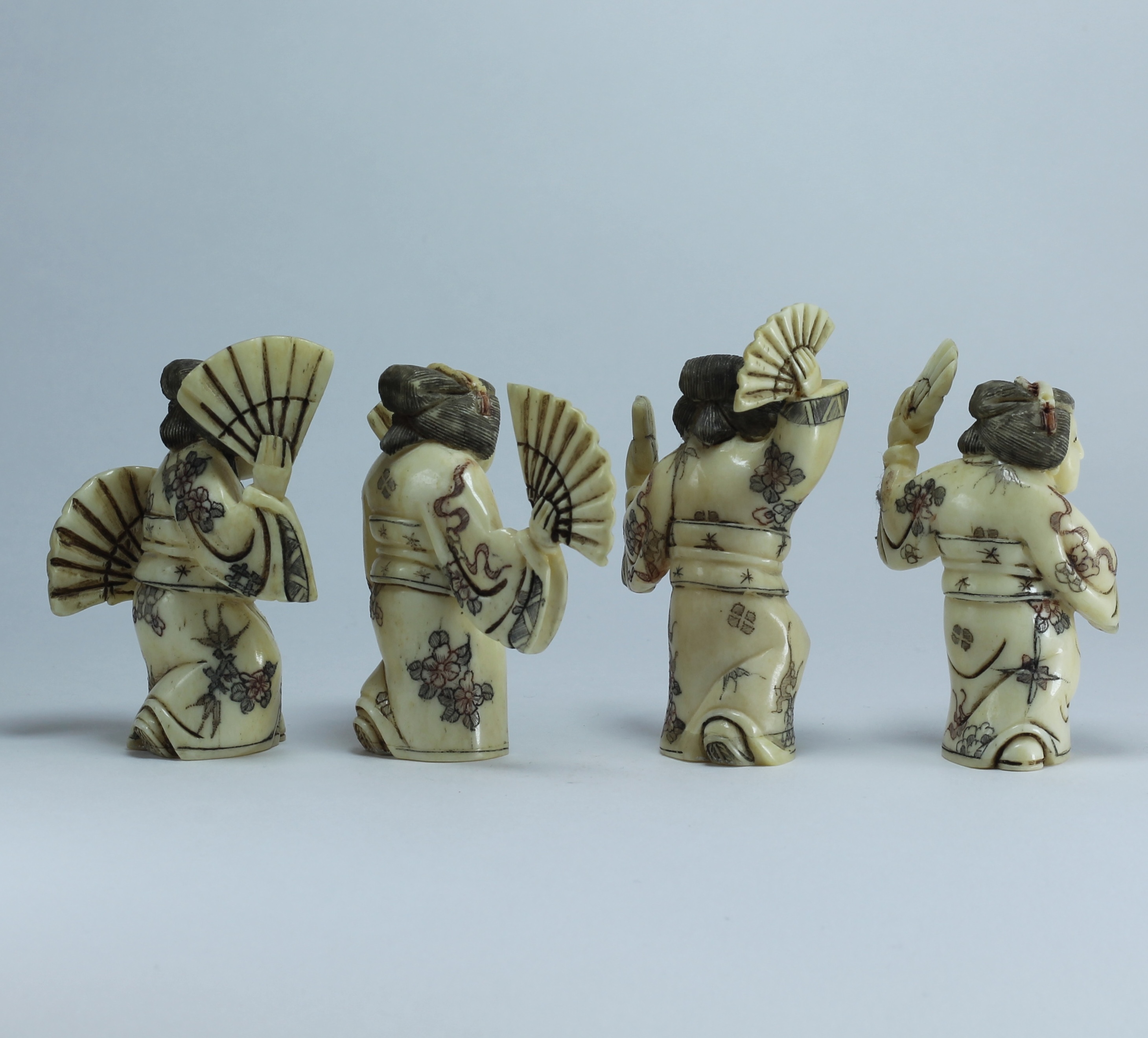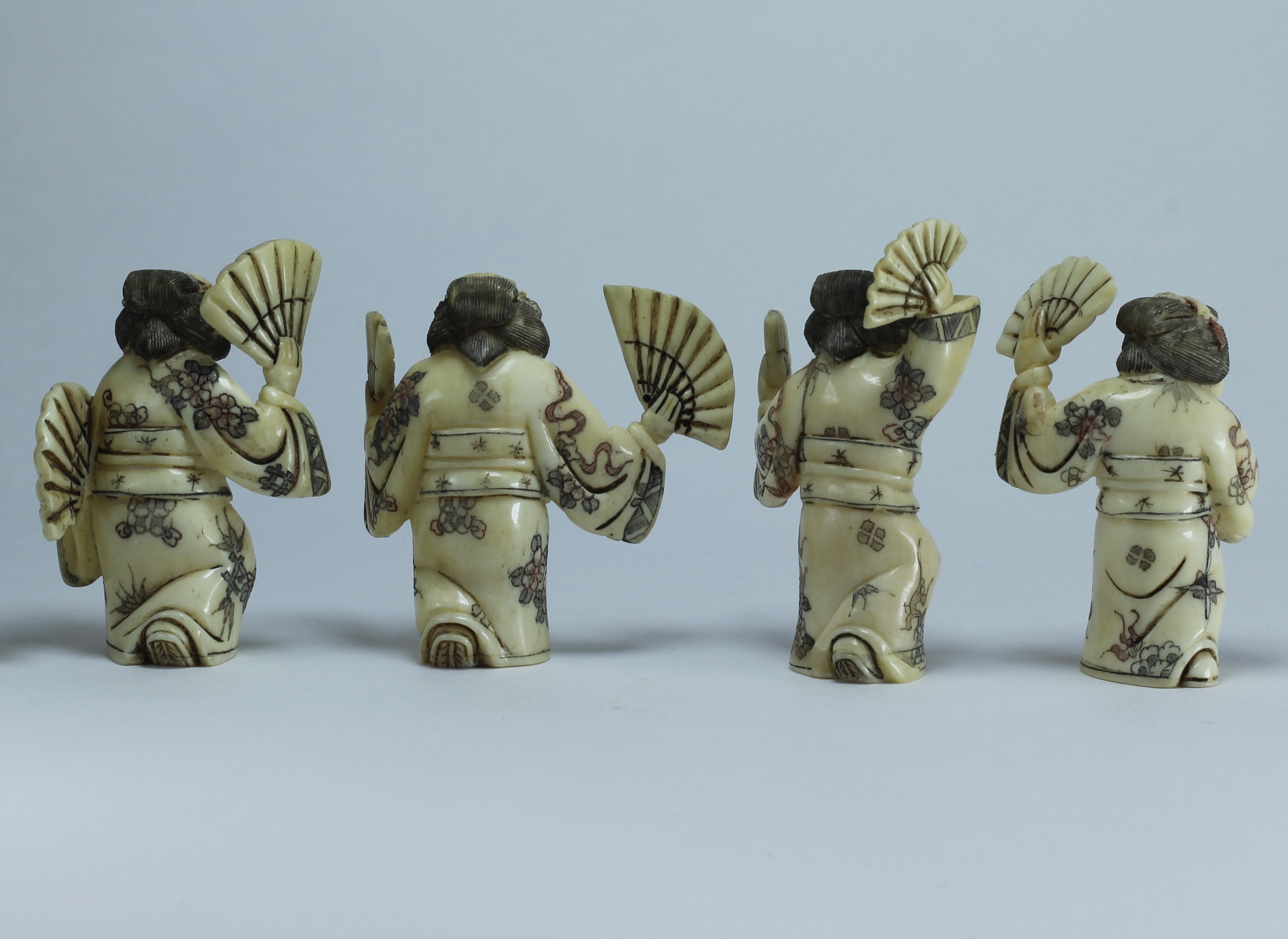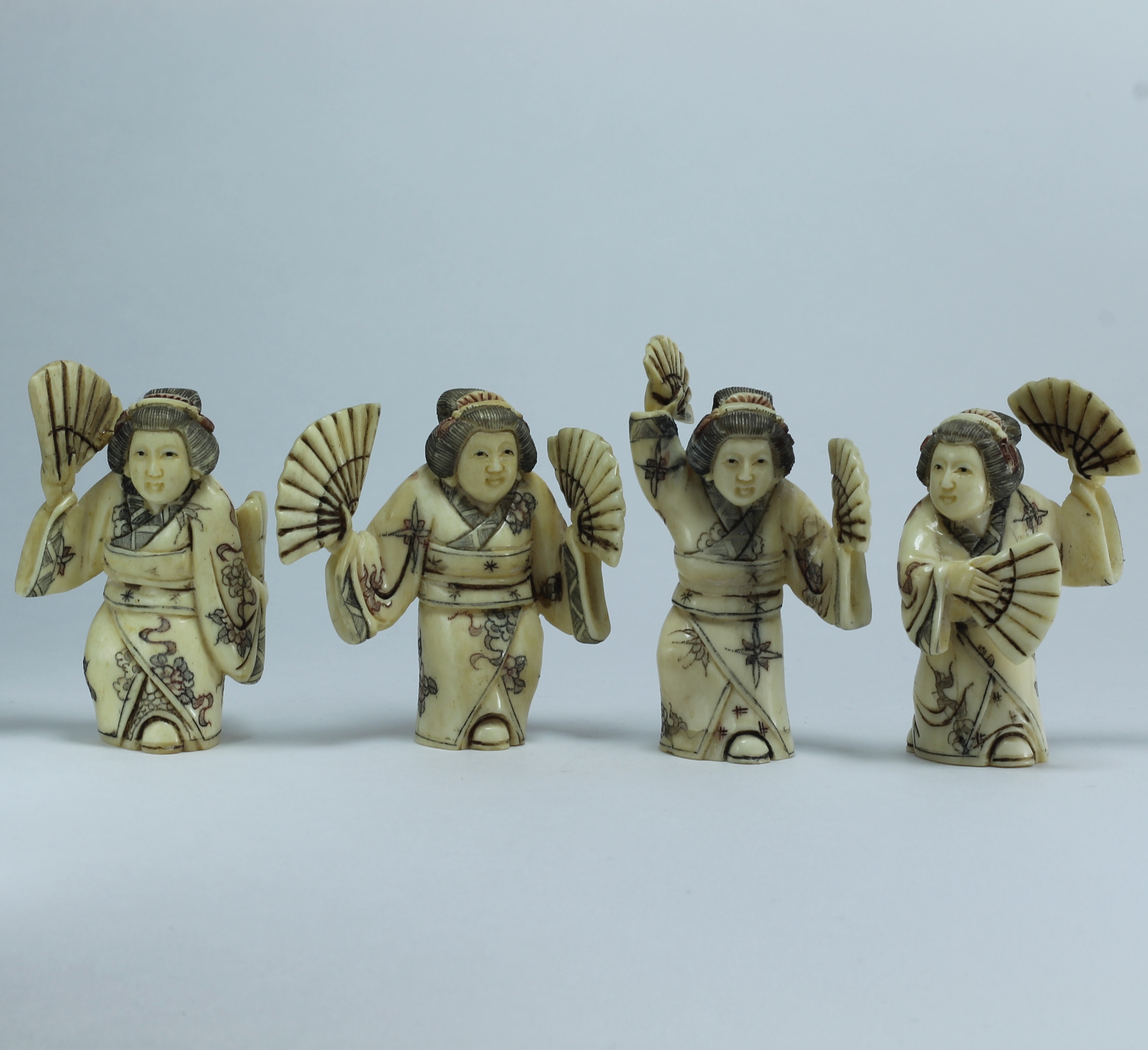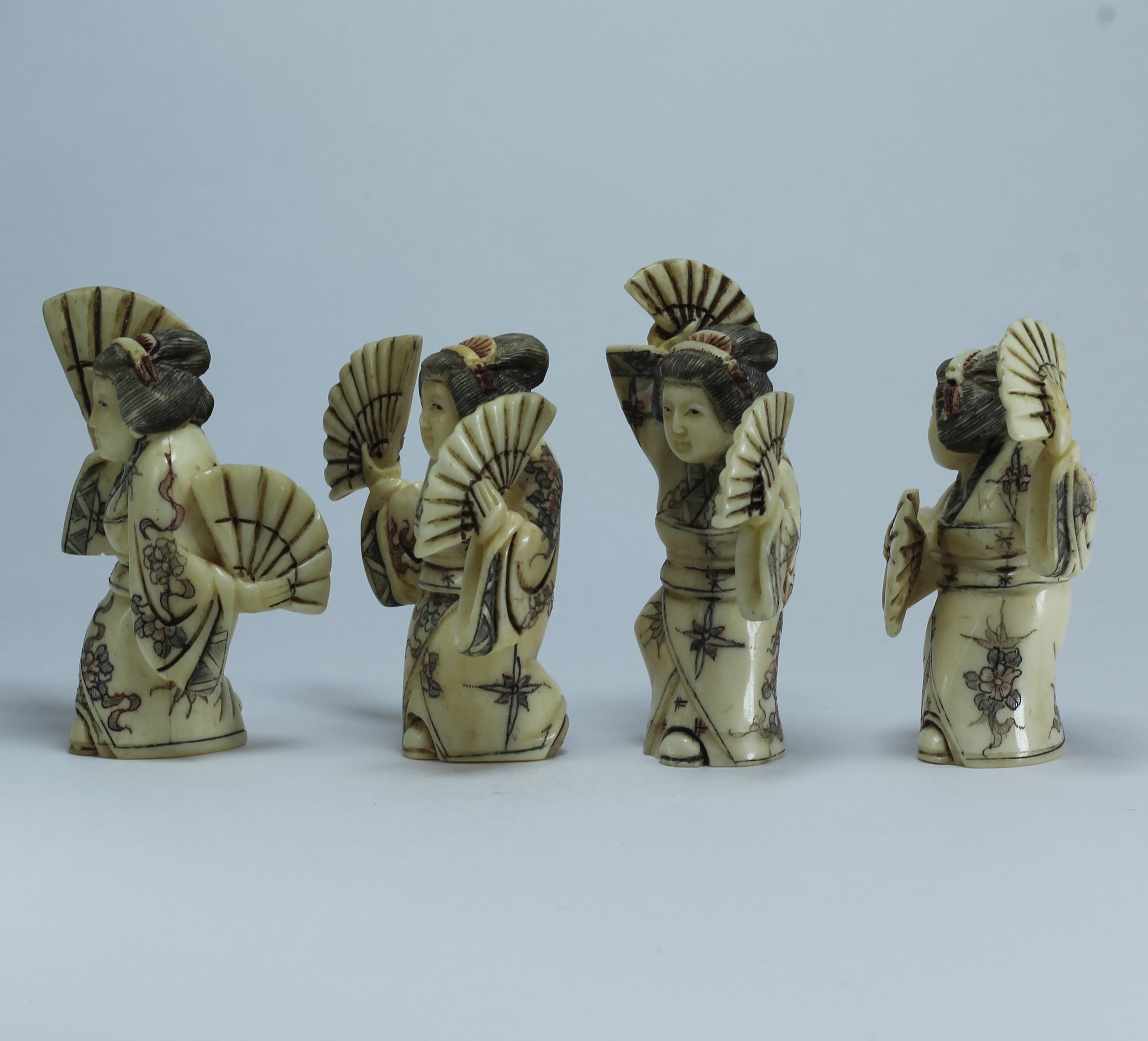 Набор нэцкэ "4 гейши" изготовлен из кости буйвола по старинной технологии, в соответствии с японскими традициями резьбы нэцкэ.